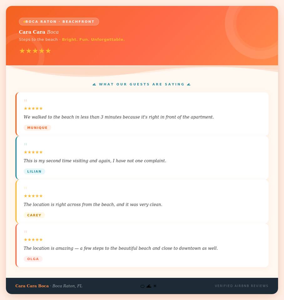 🏠 THE SPACE: COASTAL LUXURY FOR THE WHOLE CREW Designed for up to 6 guests, this expansive 1BR offers a private home with resort-style amenities. 🌙 THE SLEEP SANCTUARY Primary Retreat: Two plush Double beds with premium linens and genuine blackout curtains—designed for deep recovery after a day in the sun. Secondary Living Suite: A private lounge area featuring a Queen pull-out sofa and its own Smart TV. Perfect for giving the kids (or extra adults) their own space to unwind. 🍳 KITCHEN & DINING Skip the pricey Atlantic Ave dinners and cook at home in your kitchen (fridge, stove, oven, dishwasher, and microwave). The Morning Win: Keurig (pods included!), toaster and kettle. Apres-Beach Hour: Wine glasses included for sunset drinks. Pantry Essentials: We provide the essentials (oil, salt, pepper) so you don't have to buy a whole pantry for a 3-day stay. 🛀 BATHROOM Full shower + soaking tub Thoughtful Extras: Plush towels, dedicated makeup towels, hairdryer, and complimentary high-quality shampoo, conditioner, and body wash. 🌴 Resort-Style Amenities Why settle for a cramped hotel room? You have full, unrestricted access to our building’s outdoor oasis: Pool & Hot Tub: Soak away the salt after a day in the ocean. Grill & Chill: BBQ area with outdoor seating for Al Fresco dining. Beach Gear Included: Save $50/day on rentals! We provide 2 Tommy Bahama chairs, an umbrella, and beach towels. Post-Beach Rinse: Convenient outdoor shower to keep the sand at the beach and out of your bed. 📍 The Location: BOCA’S EXCLUSIVE SHORELINE You are perfectly positioned between nature and luxury: The Oceanfront: Located directly across the street from one of Boca’s most pristine, quiet stretches of sand. Mizner Park (5 mins): The heart of Boca for world-class dining, luxury shopping, and cinema. Red Reef Park: 3 mins away for some of the best snorkeling in Florida. FAU & Boca Resort: Minutes away—the ideal hub for graduation, business, or wedding guests. ⚡ Tech & Convenience Ultra-Fast Wi-Fi for remote work or 4K streaming. In-Unit Washer/Dryer (detergent provided)—stay sandy, stay clean. Stress-Free Entry: Secure keypad self-check-in. EV Charger: On-site shared charger available for your eco-friendly ride.